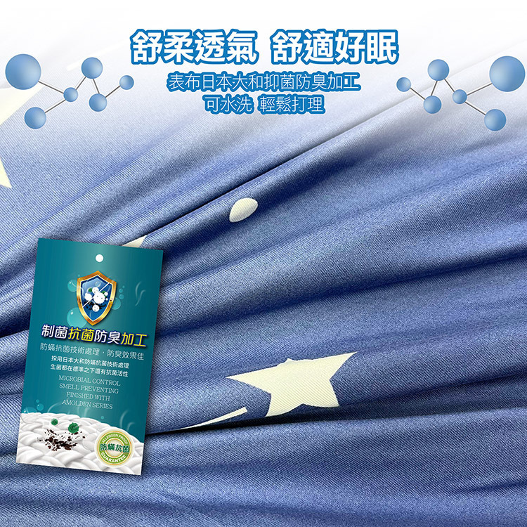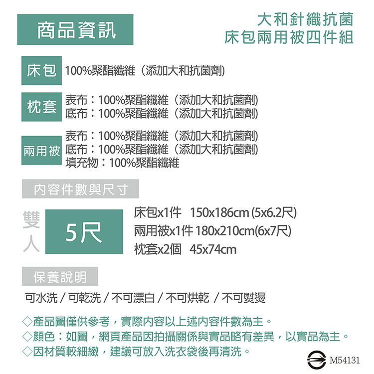 【兩用被】表布-100%聚酯纖維(添加大和抗菌劑)、底布-100%聚酯纖維(添加大和抗菌劑)、填充物-100%聚酯纖維