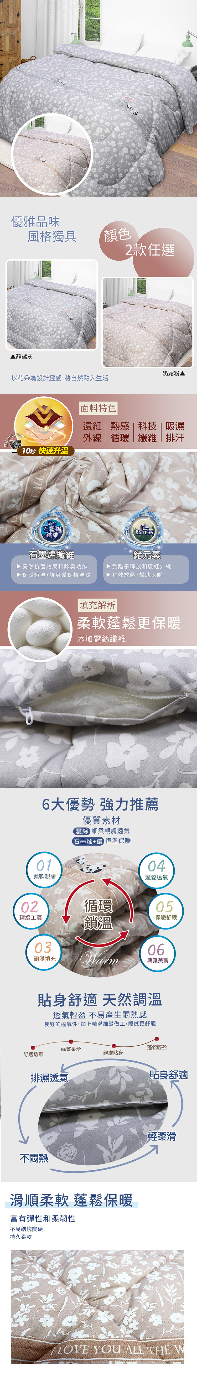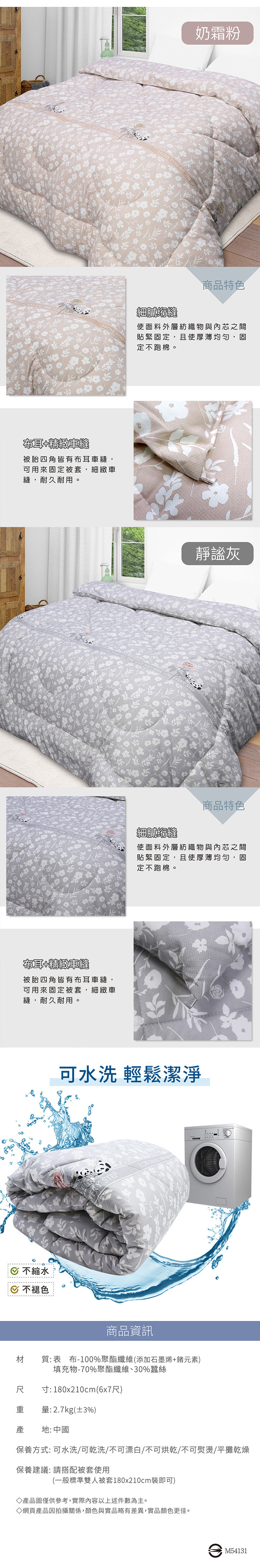 ★材質:表布-100%聚酯纖維(添加石墨烯纖維+鍺元素)、填充物-70%聚酯纖維、30%蠶絲 ★產地:中國 ★內容件數與尺寸: 數量:鍺抗菌可水洗蠶絲被x1件 尺寸:180x210cm±3%(6x7尺) ★網頁圖片因拍攝關係,與實品略有差異,實際顏色以出貨為主 ★產品圖僅供參考,實際內容以上述內容件數為主。 ★可水洗╱可乾洗╱不可漂白╱不可烘乾╱不可熨燙/陰涼處晾乾 ★ ※建議使用洗衣袋清洗 ※不可使用柔軟精 ※建議可外加被套使用
