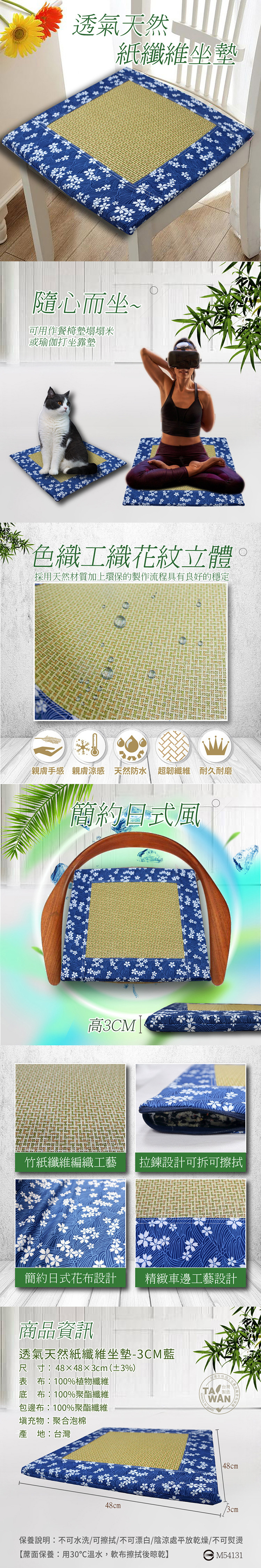 ★內容件數:天然紙纖記憶立體坐墊x1 ★材質: 表布-100%聚酯纖維 底布-100%聚酯纖維 包邊布-100%聚酯纖維 填充物-記憶聚合棉、泡棉 ★產地:台灣 ★尺寸:48x48x3cm ±3% ★產品圖僅供參考,實際內容以上述內容件數為主。 ★清潔保養方式:保養方式-不可水洗/可擦拭/不可漂白/不可烘乾/不可熨燙/陰涼處平攤乾燥 ★蓆面保養方式-水溫30℃軟布擦拭後晾乾即可 ★內材保養說明:內材保養說明:不可水洗/不可乾洗/不可用機器洗滌/陰涼處平攤乾燥