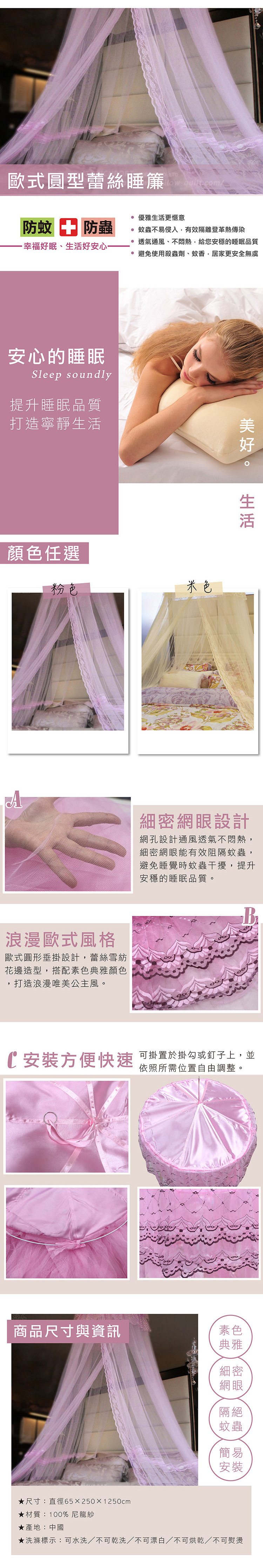 ★材質:100%尼龍紗 ★內容件數:歐式圓型蕾絲睡簾*1 ★產地:中國 ★尺寸:直徑65×250×1250cm ★網頁圖片因拍攝關係,與實品略有差異,實際顏色以出貨為主 ★產品圖僅供參考,實際內容以上述內容件數為主。 ★表布洗滌方式:可水洗╱不可乾洗╱不可漂白╱不可熨燙