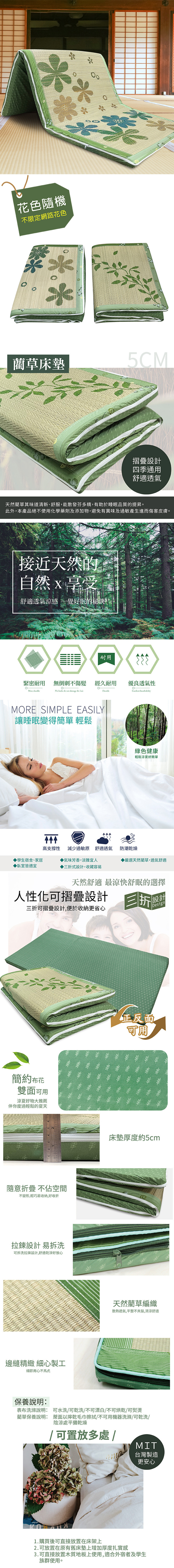 ★材質: 表布-100%聚酯纖維 表層-100%天然藺草 填充物-100%聚酯纖維 ★特色: 天然藺草其味道清新、舒服,能散發芬多精,有助於睡眠品質的提升。 本產品絕不使用化學藥劑及添加物,避免有異味及過敏產生進而傷害皮膚 日本東京大學研究證明,在舖有草藝品的房內關閉一小時可將室內二氧化碳淨化 ★內容件數:日式床墊x1 (單人-3*6.2尺) ★產地:台灣 ★清潔保養方式:蓆面以擰乾毛巾擦拭╱不可用機器洗滌╱以乾洗溶劑清洗╱陰乾